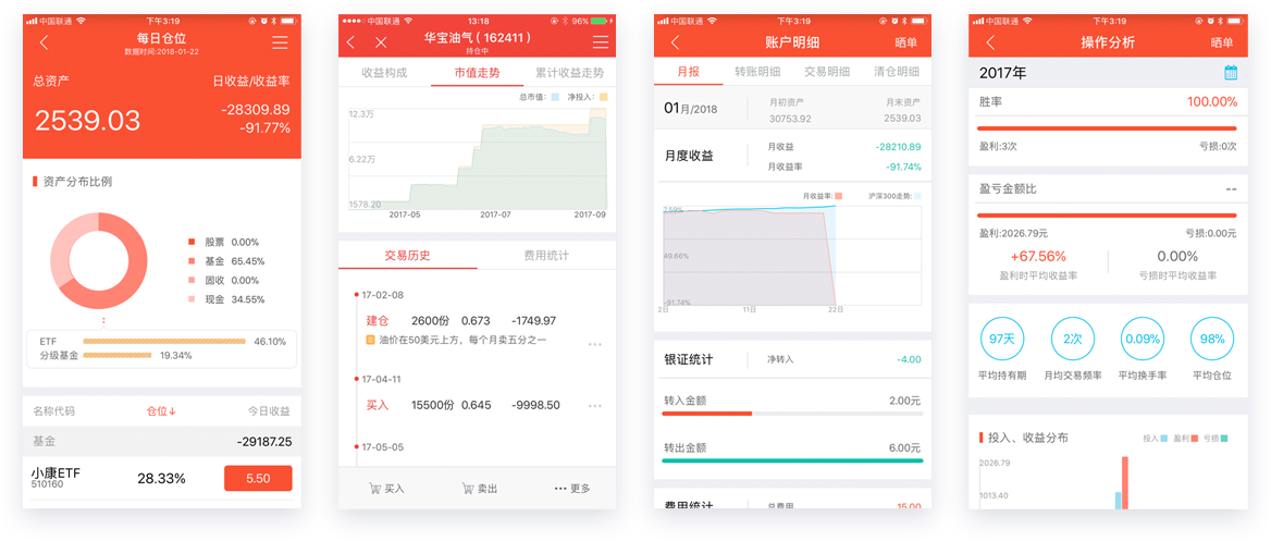 全面展示用户投资收益情况,回溯历史每天仓位分布,覆盖场内交易品种,智能分析用户投资属性