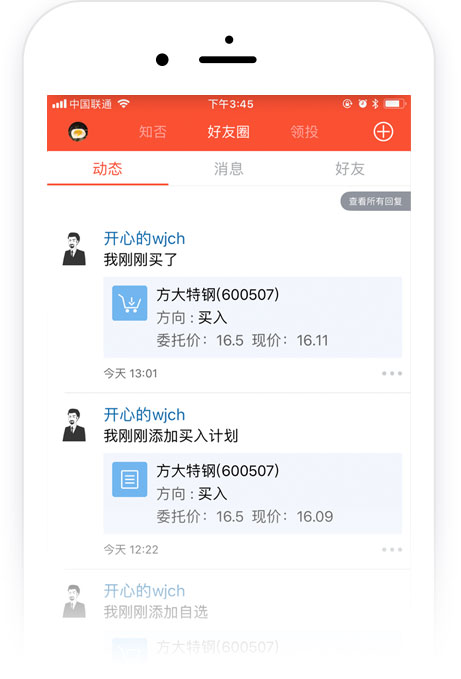 客户交易动态,投资建议 好友圈形式实时同步 投后建议,咨询回答 实时文字语音交流